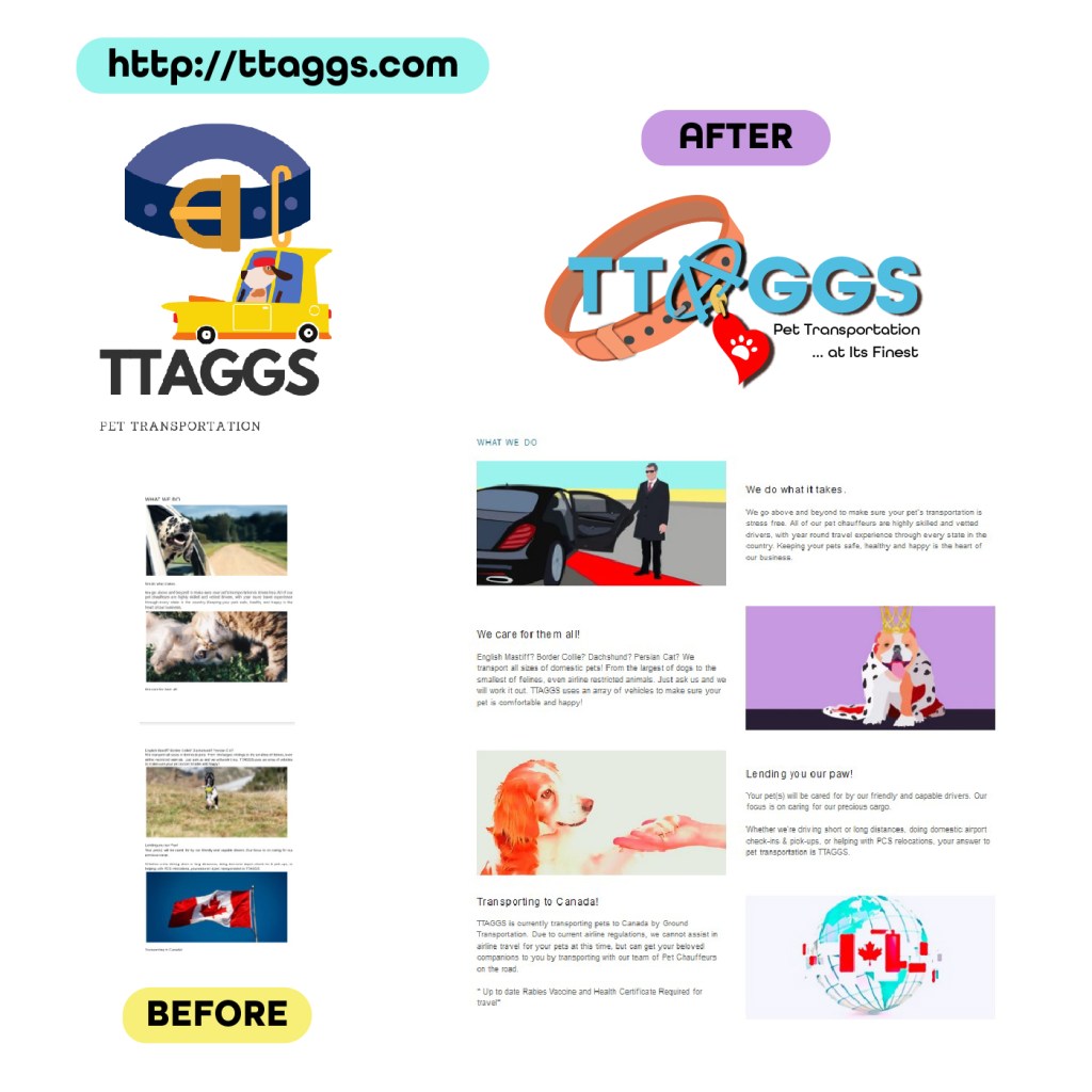 TTAGGS is a pet transport company, primarily serving ground transport in the USA and Canada. It had a DIY look which worked, but didn’t really have any style and the logo felt cramped. See before and after examples.